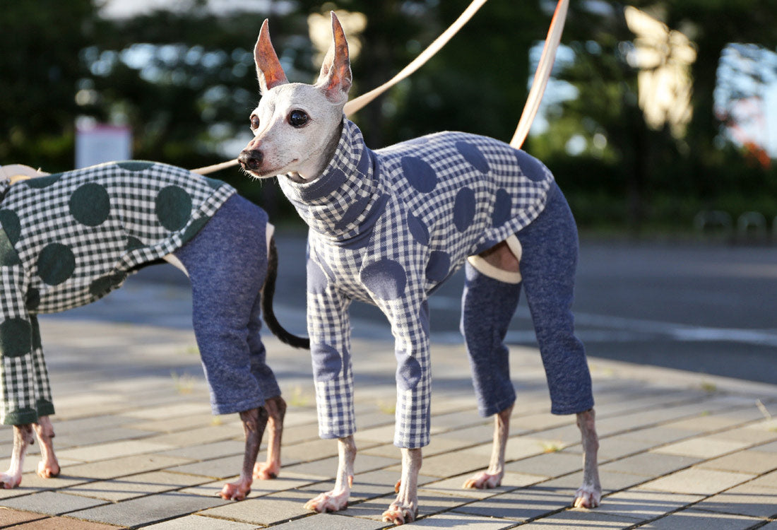 Crafted from premium knit fabric produced in the renowned textile manufacturing region of the Tokai area in Japan, our attire is tailored exclusively for Italian Greyhounds.