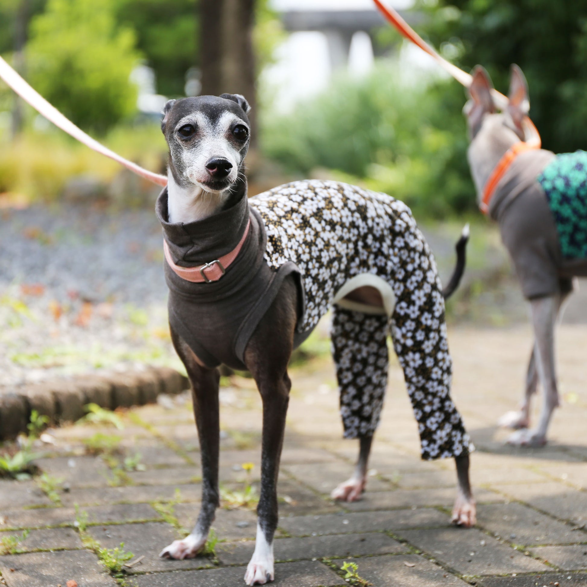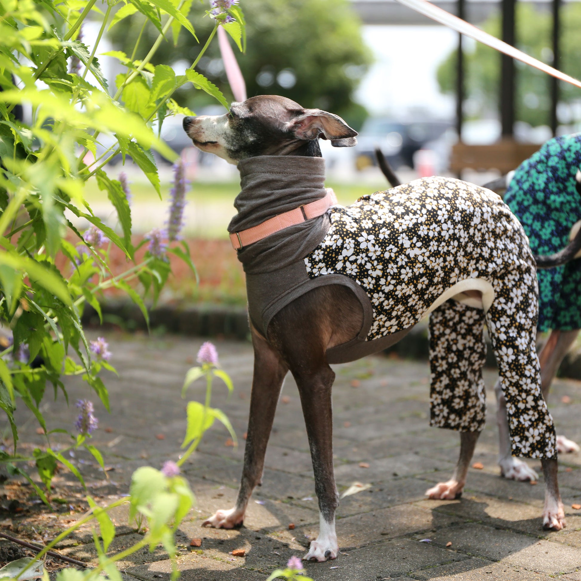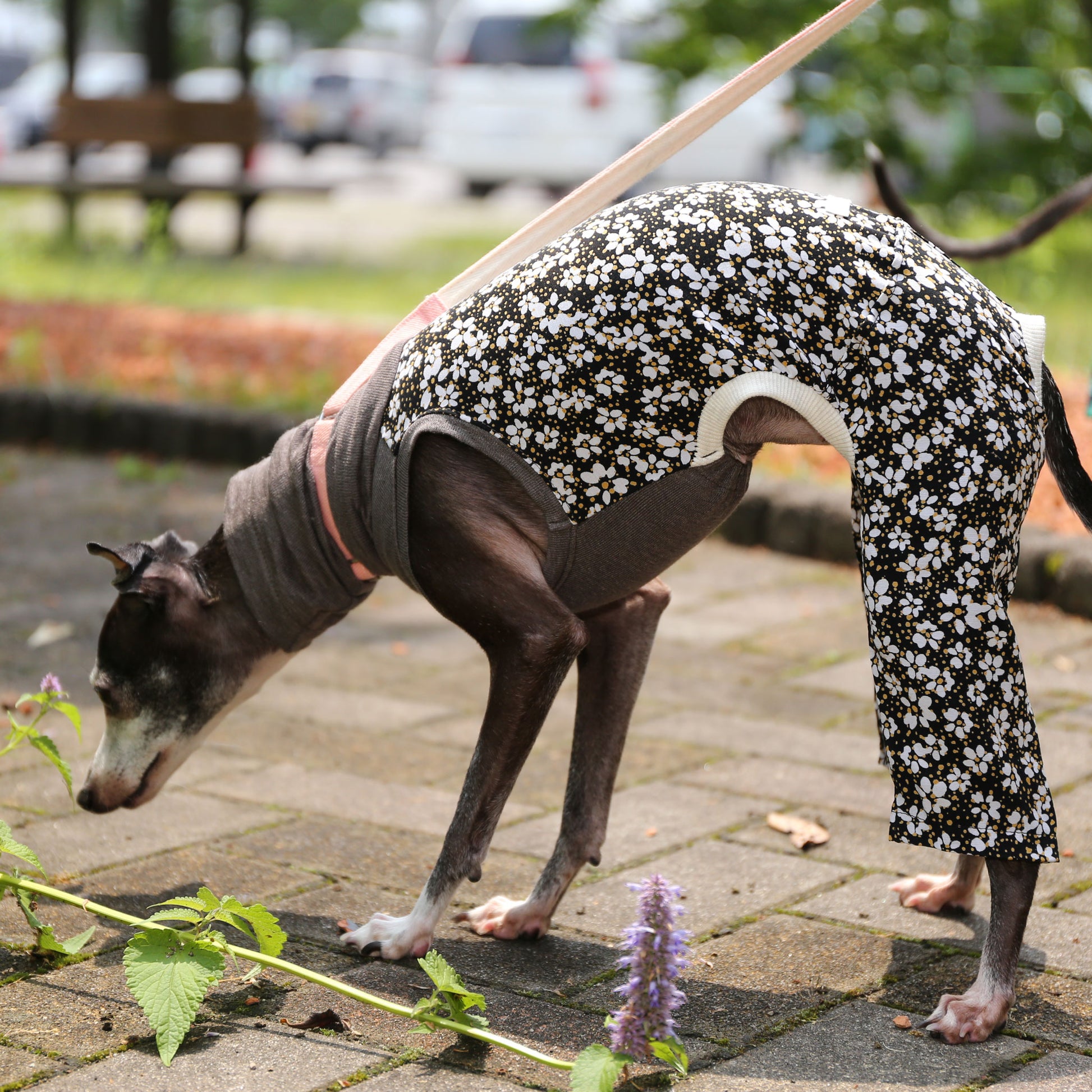 The floral part is not elastic, so the pants are our thicker width type.