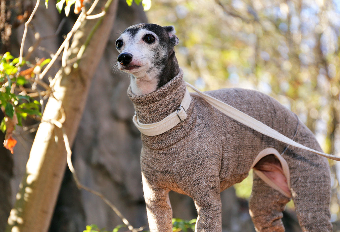 This Italian Greyhound romper features a beautifully textured knit, crafted with thick yarn for a naturally rustic look. The inner surface is brushed for extra warmth and a soft, gentle feel against the skin.